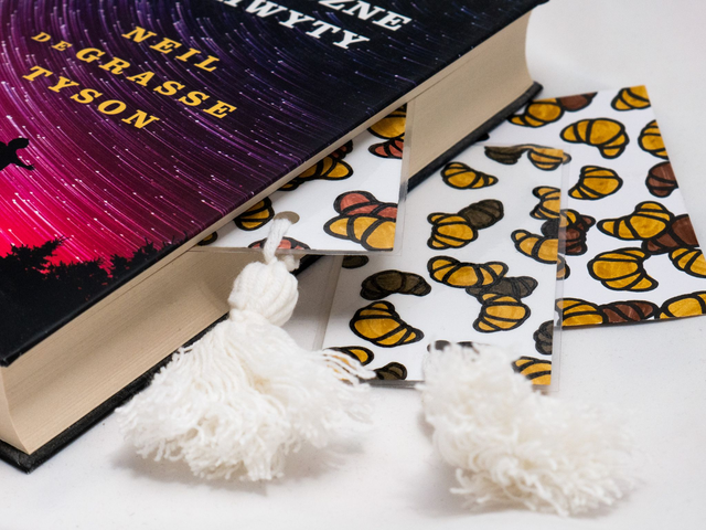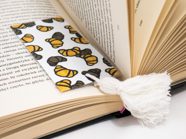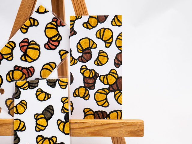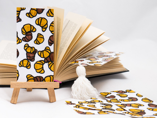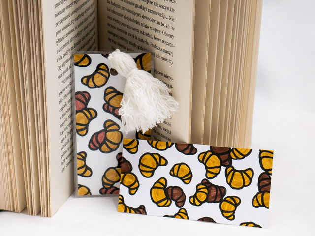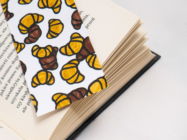 Zakładka do książki z croissantami została ręcznie narysowana na niewykorzystanych skrawkach papieru. Powstała w duchu recyklingu. Każda zakładka z croissantem została ręcznie narysowana w mojej pracowni, za pomocą markerów akwarelowych i cienkopisów kreślarskich.
