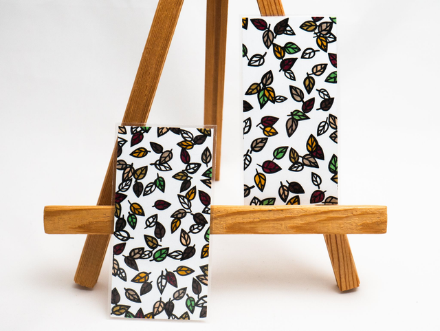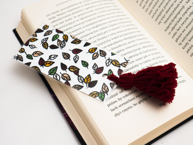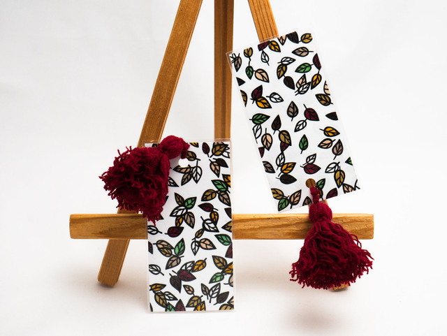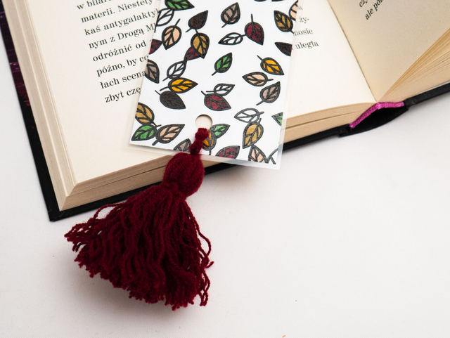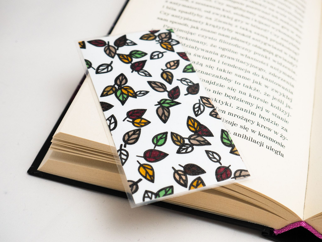 Zakładka do książki z liścmi została ręcznie narysowana na niewykorzystanych skrawkach papieru. Powstała w duchu recyklingu. Każda zakładka w liście została ręcznie narysowana w mojej pracowni, za pomocą markerów akrylowych i cienkopisów kreślarskich.