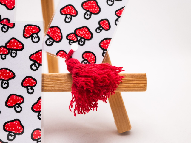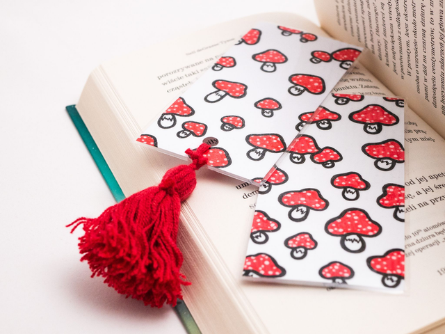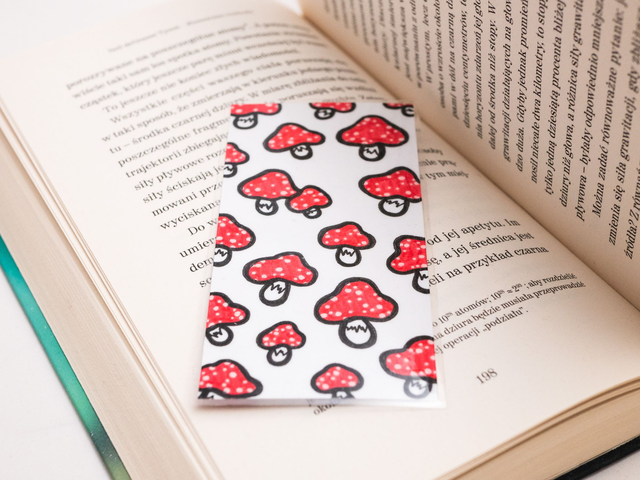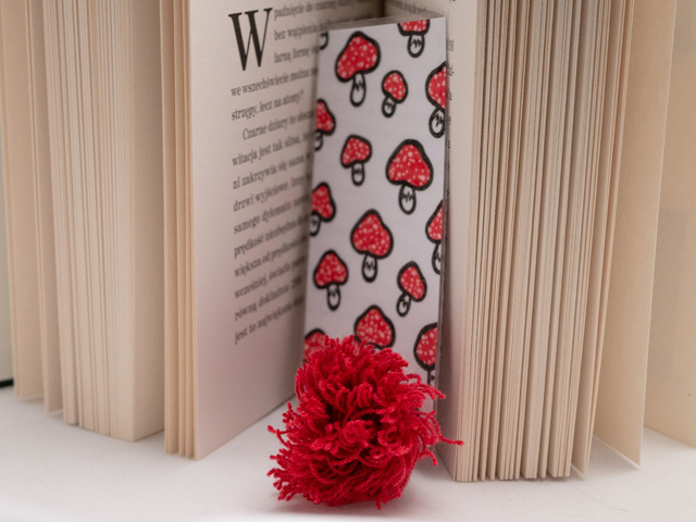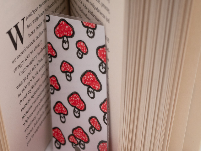 Zakładka do książki z muchomorkami została ręcznie narysowana na niewykorzystanych skrawkach papieru. Powstała w duchu recyklingu. Cienka, wygodna w użyciu, pasuje i do wydań kieszonkowych, i większych woluminów.