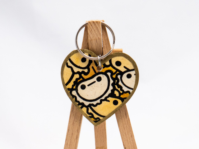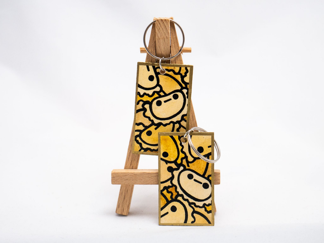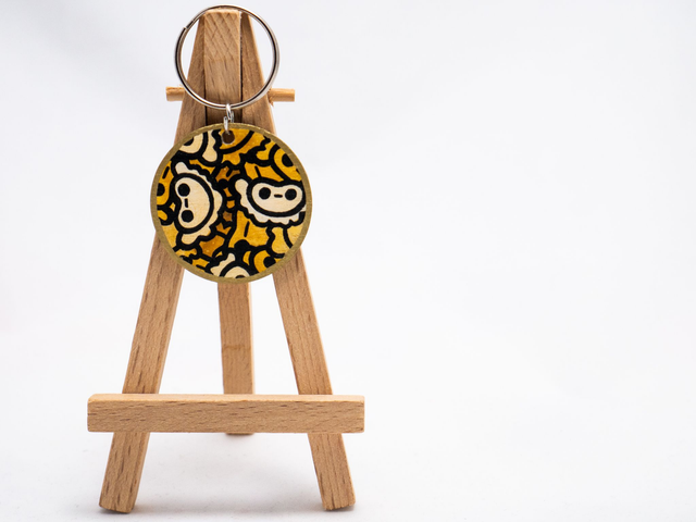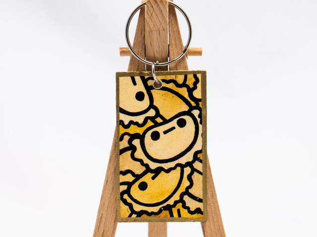 Brelok jest dwustronny, malowany na drewnianej bazie. Zabezpieczony satynowym lakierem dla większej trwałości i głębszych kolorów.